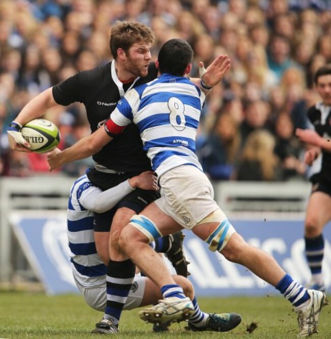 Rockwell College’s Diarmuid Aidan Moynihan and Aidan Bulter tackle Jack Dinneen of Crescent. ©INPHO/Cathal Noonan