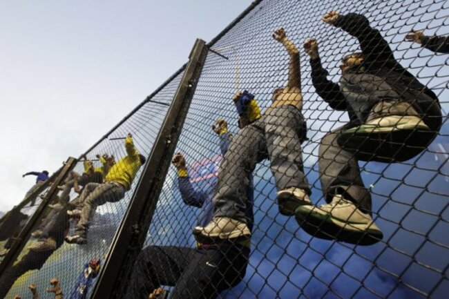 Behind the goals, supporters begin scaling he fence