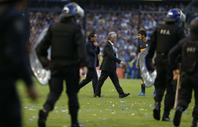 River coach Ramon Diaz crosses the field during the stoppage