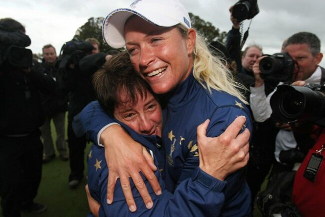 Suzann Pettersen (right) celebrates with team captain Alison Nicholas. Credit: Julien Behal/PA Archive/Press Association Images