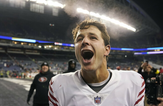 Niners QB Brock Purdy celebrates. Marcio Jose Sanchez