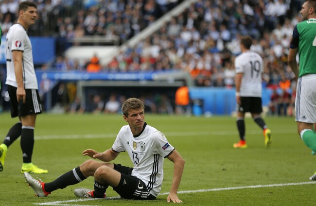 Thomas Mueller, centre, reacts after a missed chance to score during the Euro 2016 Group C soccer match between Northern Ireland and Germany at the Parc des Princes. Francois Mori