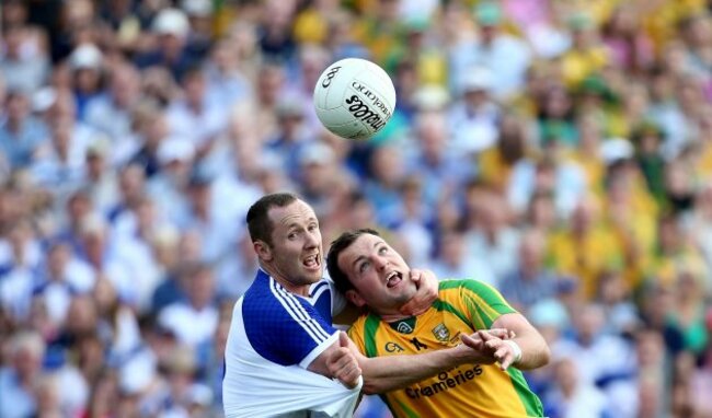 Donegal’s Michael Murphy does battle with Monaghan’s Vincent Corey (©INPHO/Presseye/William Cherry)