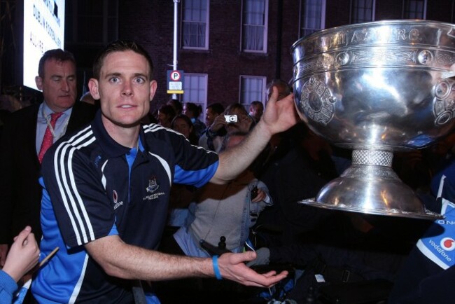 Free-taking hero Stephen Cluxton with the Sam Maguire at the homecoming on Monday night.