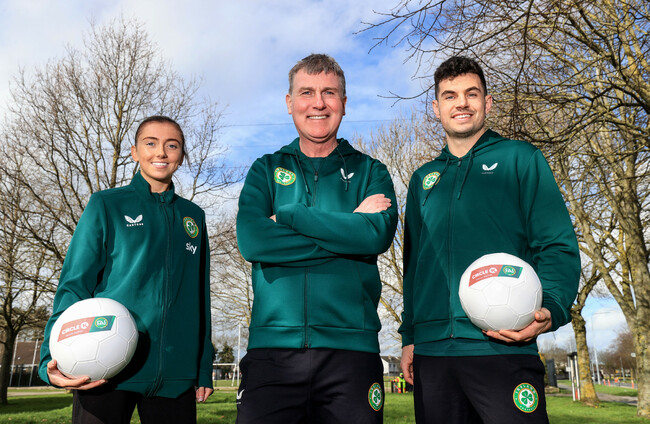 Abbie Larkin, Stephen Kenny and John Egan pictured at the launch of Circle K’s new partnership with the Football Association of Ireland. Dan Sheridan/INPHO