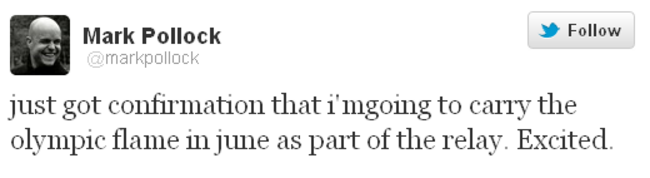ADVERTURER MARK POLLOCK today announced that he would be part of the Olympic torch relay when the famous flame hits Dublin on 6 June this year.