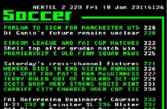 Putting the football scores on 221 meant wearing down those numbers on the remote – particularly during the Premiership games only shown on Sky. This was also the page on which Irish goalscorers were shaded in green with those sent off written in red.