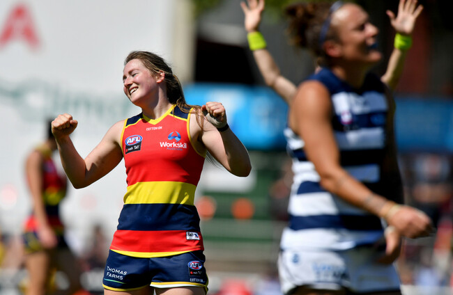 Ailish Considine of the Adelaide Crows reacts on the final siren following the Round 3 AFLW match between the Crows and the Geelong Cats in February. AAP/PA Images