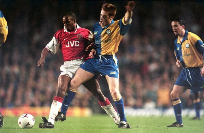 Maybury tackles Arsenal's Ian Wright during a Premiership clash in 1997. EMPICS Sport
