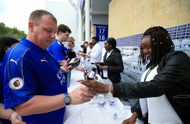 Leicester City fans given free beers outside the King Power Stadium in 2016.