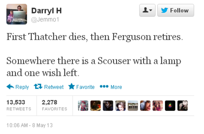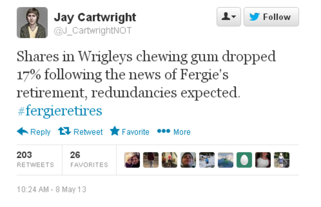 LIKE ANY MAJOR story, news of Alex Ferguson’s retirement has brought out the worst in every wannabe comedian, rehashing the same set of jokes in desperate attempt to seem funny.