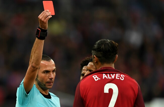 Alves was sent off in the 35th minute for a reckless head-high challenge on Kane that left the Tottenham forward with several scratches on his face and shoulder as England ran out 1-0 winners at Wembley.