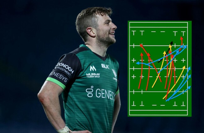 Below, we see an illustration of his defensive contributions across the 80 minutes, including tackles, turnovers, and other jackal attempts. Again Connacht are playing from left to right in this depiction.