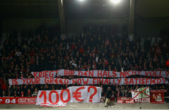 Supporters threw fake bank notes onto the pitch and displayed a banner, which read: ‘”€100? Is your gr€€d [sic] now finally $atisfied?”‘.