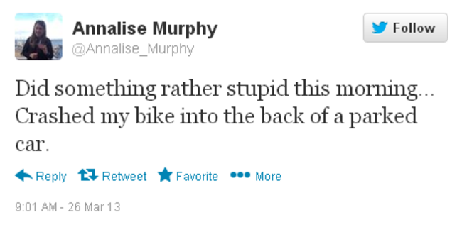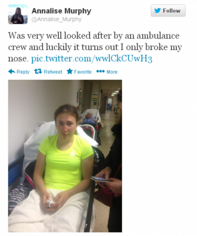 IRISH OLYMPIAN ANNALISE Murphy was tweeting pictures from a hospital trolley this week after an unfortunate collision — with the back of a parked car.
