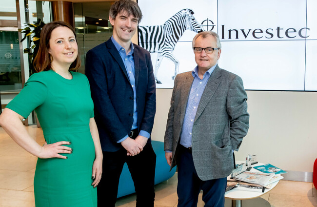 Niall Kelly, deputy editor of The42, accepting the inaugural Investec 20x20 Media Award on behalf of Eoin O'Callaghan, with judging panel chair, Anna Kessel and Michael Cullen, Investec CEO. Morgan Treacy/INPHO