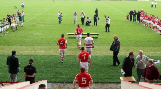 Cork players run onto the pitch on Leeside yesterday. Pic: INPHO/Lorraine O’Sullivan