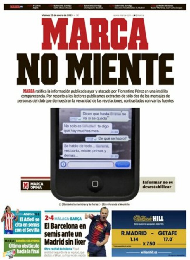 SPANISH NEWSPAPER MARCA has backed up reports of a dressing room struggle to oust Real Madrid coach Jose Mourinho with a front page splash featuring messages from its club sources.