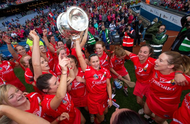Goalkeeper Aoife Murray celebrates with the O'Duffy Cup after Cork's win over Galway last September. Ryan Byrne/INPHO