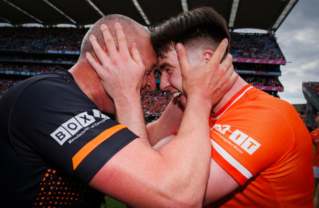 Ben Crealey and his midfield colleague Niall Grimley after Armagh's victory. Laszlo Geczo / INPHO