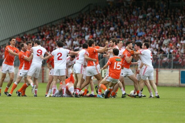 Before the game even started, Armagh’s Aiden Forker and Mattie Donnelly of Tyrone picked up yellow cards for their part in a melee involving several players.