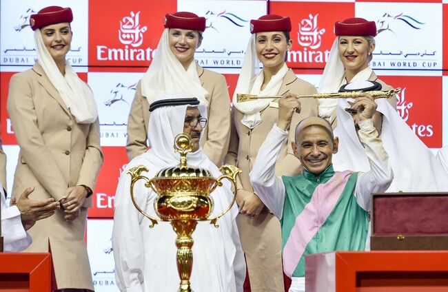 Mike Smith, jockey of Saudia Arabia, bottom right, celebrates with the Deputy Ruler of Dubai, Sheikh Hamdan bin Rashid Al Maktoum, as he holds the golden whip after winning the U.S. $ 10,000,000 Dubai World Cup horse racing at the Meydan Racecourse. Untitled