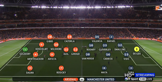 The visitors have just kicked off with Patrice Evra lumping a long ball forward for Van Persie to run onto. It runs all the way through to Szczesny.