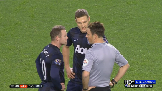 Rooney is receiving a talking to by referee Mark Clattenburg.
