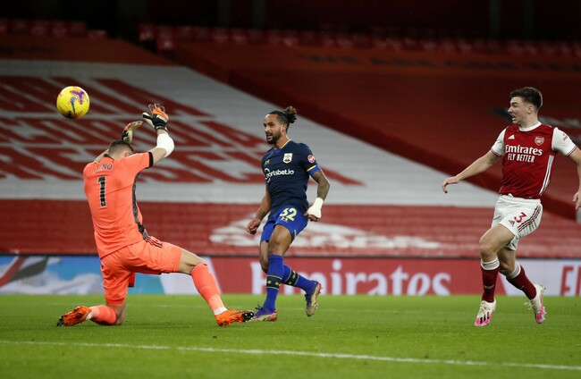 Bednarek deflected Saka’s low cross goalwards as Arsenal found a foothold, but Alex McCarthy conjured a fine reaction stop.