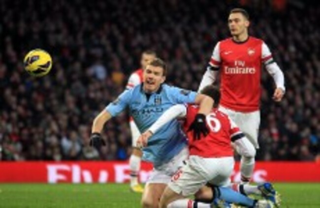 Dzeko turns Koscielny and is then unceremoniously dragged down by him.