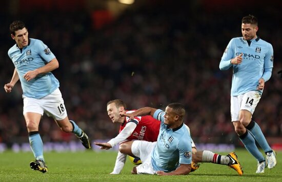 (Manchester City’s Vincent Kompany (right) tackles Arsenal’s Jack Wilshere (left) before being issued a red card - Stephen Pond/EMPICS Sport)