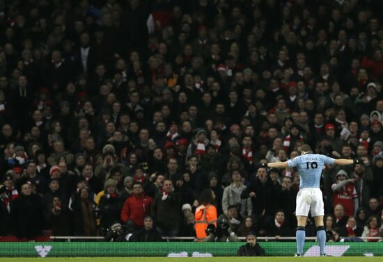 (Manchester City’s Edin Dzeko celebrates in front of Arsenal fans after scoring his sides 2nd goal during their English Premier League soccer match at Arsenal’s Emirates Stadium – Alastair Grant/AP/Press Association Images)