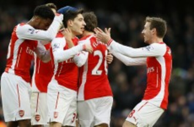 Arsenal's Hector Bellerin, second left, celebrates with teammates after he scored their fifth goal against Villa. AP/Press Association Images