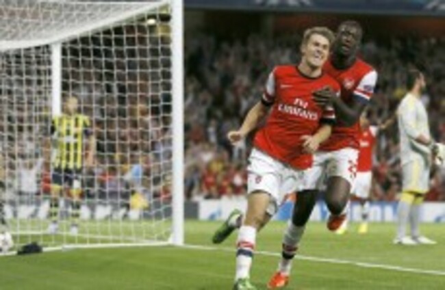 Double down: Arsenal's Aaron Ramsey, left, celebrates his second goal against Fenerbahce with teammate Yaya Sanogo . Kirsty Wigglesworth/AP/Press Association Images