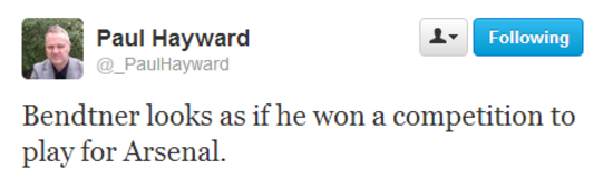 Arsenal playing an odd 4-5-1 at present with Bendtner ambling around up front on his own. The three in the middle for Arsenal are all neat and tidy operators. Bendtner has Arsenal’s first shot on goal (if you could call it that). It hits Cesar Azpilicueta in the back of the head. The Danish striker is jogging around the Emirates with a hairstyle very much like Tom Cruise in the Last Samurai.