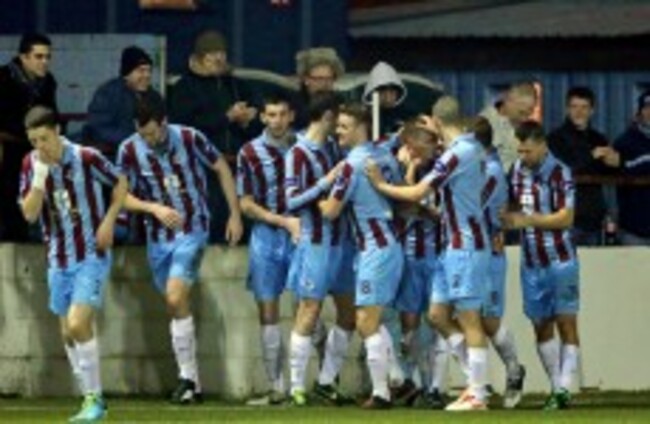 Drogheda United players congratulate Eric Foley after his opening goal. Morgan Treacy/INPHO