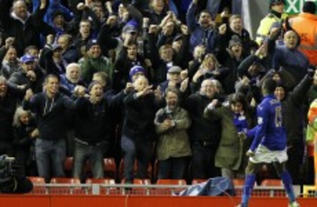 Leicester fans celebrate their team's equaliser. Peter Byrne