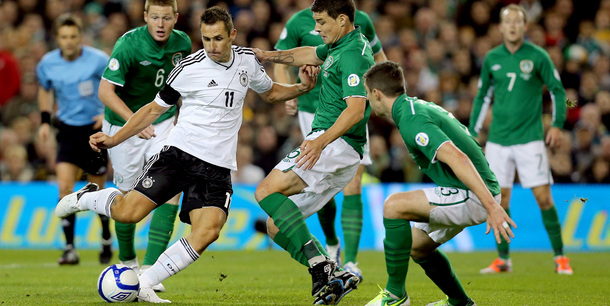 Which of these players scored a brace in Ireland's largest ever competitive home defeat against Germany?