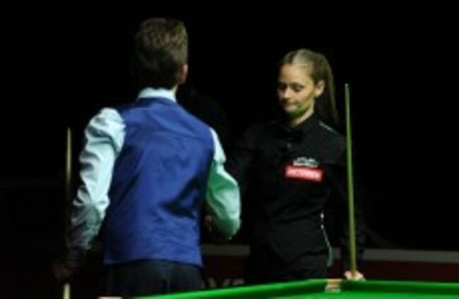 Ken Doherty shakes hands with Reanne Evans after his victory in their match at the World Championship Qualifying at Ponds Forge, Sheffield. Tim Goode