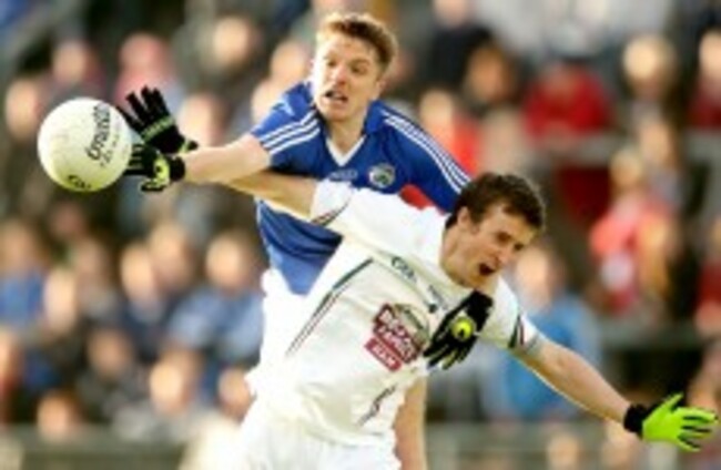 John O'Loughlin of Laois holds off a challenge from Kildare's Paul Cribbin. James Crombie / INPHO