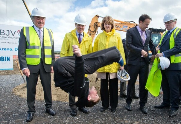 Oisin O'Connell celebrates the turning of the sod at the national indoor arena in Abbottstown.