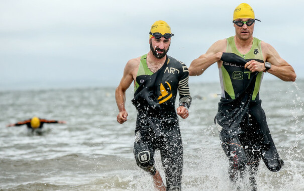 Kevin Keane and Brendan Crawford leave the water during the Lissadell Standard triathlon.