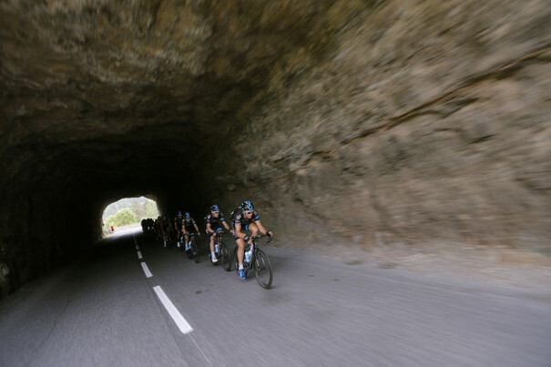 Team Sky lead the peloton through a tunnel during the 14th stage of Le Tour.