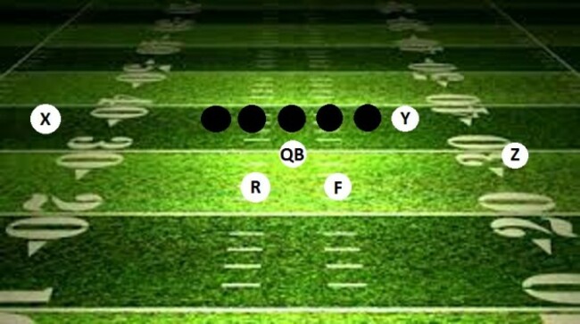 So-called because it spreads the field, this is a very effective pass formation because of the number of receivers but also works well in the run game because it forces the defence to respect the pass which means they can’t be as aggressive when defending the run.