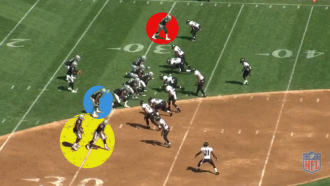 The Raiders are in their 11 personnel grouping (one running back, one tight end) with two wide receivers (yellow) and the tight end (blue) in a bunch formation to the right while Cooper (red) is split out on his own to the left.