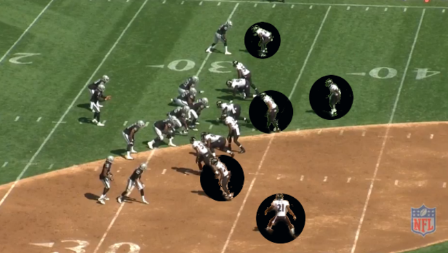 Oakland are facing a long third down in their own half and, even though running back Latavius Murray is in the backfield, this is almost certainly a passing situation.