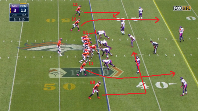 Manning has four passing options on this play with two receivers running deep fades (Emmanuel Sanders #10, Jordan Norwood 11), Demaryius Thomas (#88) running a flat and Andrew Caldwell (#12) running a curl route.