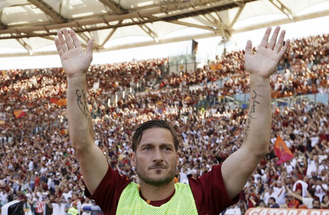 Francesco Totti salutes his fans after an Italian Serie A soccer match between Roma and Genoa at the Olympic stadium. Alessandra Tarantino