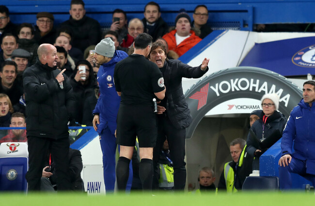 Sent off by Swarbrick, Conte retreated to the seats behind the Chelsea bench, where he continued to shout towards Mason before eventually calming down.