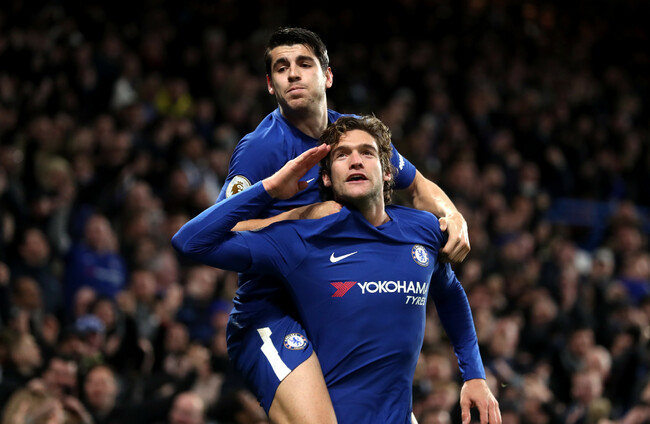 Chelsea's Marcos Alonso celebrates scoring his side's second goal of the game with Alvaro Morata (top. Adam Davy
